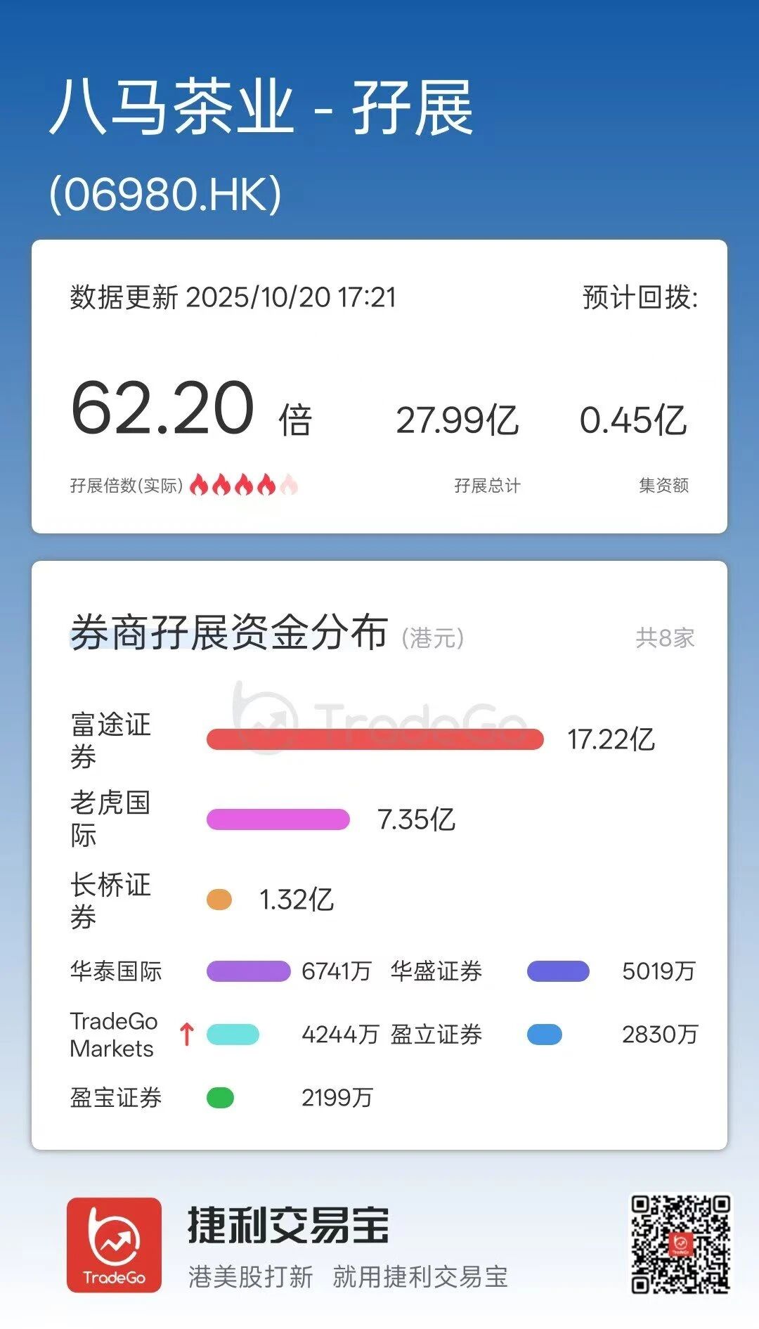 据捷利交易宝的新股孖展数据,截至10月20日17时,八马茶业首日的孖展总额约27.99亿港元,孖展认购倍数约62.20倍。其中,富途证券、老虎国际、长桥证券分别放出17.22亿、7.35亿、1.32亿港元。