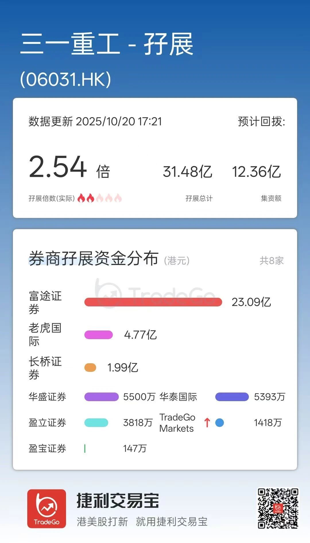 据捷利交易宝的新股孖展数据,截至10月20日17时,三一重工首日的孖展总额约31.48亿港元,孖展认购倍数约2.54倍。其中,富途证券、老虎国际、长桥证券分别放出23.09亿、4.77亿、1.99亿港元。