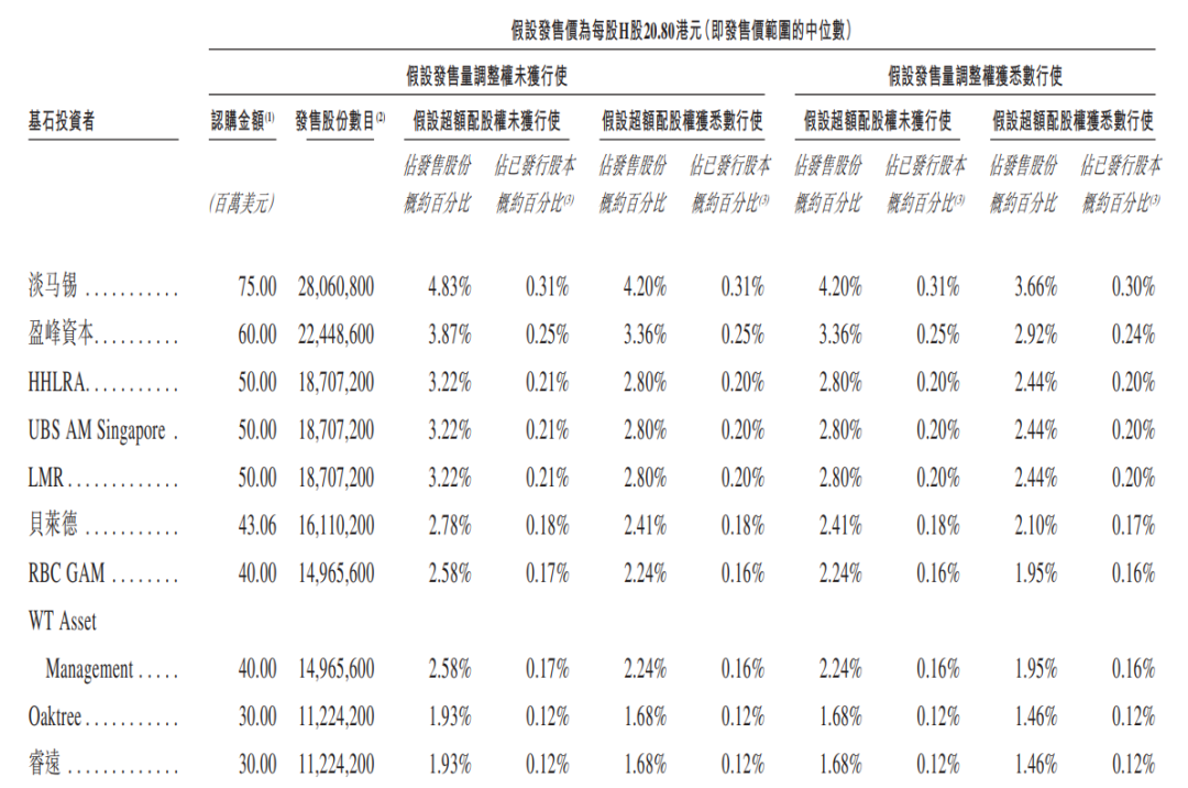 若按中间价20.80港元计,募资总额约120.73亿港元;若公开固定10%,则国配部分约占108.66亿港元,本次有23家基石投资者参与,约58.99亿港元,占全球发售的48.86%。