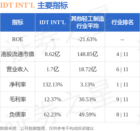 IDT INT'L港股市值8.62亿港元,在其他轻工制造行业中排名第4。主要指标见下表: