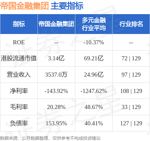 帝国金融集团港股市值3.14亿港元,在多元金融行业中排名第72。主要指标见下表: