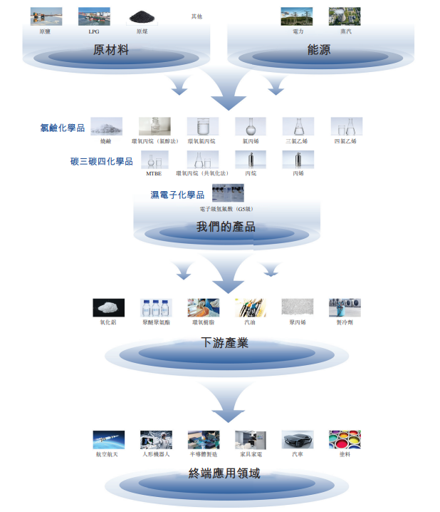 碳四化学品及湿电子化学品三大核心板块,并拥有全面的产品组合。