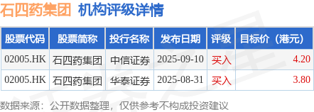 投行对该股的评级以买入为主,近90天内共有2家投行给出买入评级,近90天的目标均价为4港元。中信证券最新一份研报给予石四药集团买入评级,目标价4.2港元。