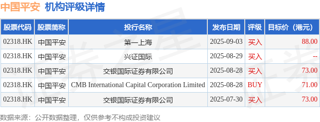 截至2025年10月28日收盘,中国平安(02318.HK)报收于56.15港元,上涨0.27%,成交量2938.23万股,成交额16.47亿港元。投行对该股的评级以买入为主,近90天内共有4家投行给出买入评级,近90天的目标均价为76.25港元。第一上海最新一份研报给予中国平安买入评级,目标价88港元。