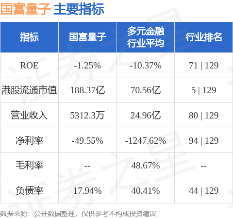 国富量子港股市值188.37亿港元,在多元金融行业中排名第5。主要指标见下表: