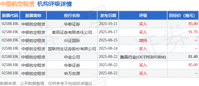 截至2025年10月28日收盘,中银航空租赁(02588.HK)报收于68.85港元,下跌1.99%,成交量62.55万股,成交额4311.04万港元。投行对该股的评级以买入为主,近90天内共有5家投行给出买入评级,近90天的目标均价为85.78港元。华泰证券最新一份研报给予中银航空租赁买入评级,目标价85港元。