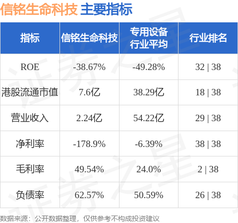 信铭生命科技港股市值7.6亿港元,在专用设备行业中排名第18。主要指标见下表: