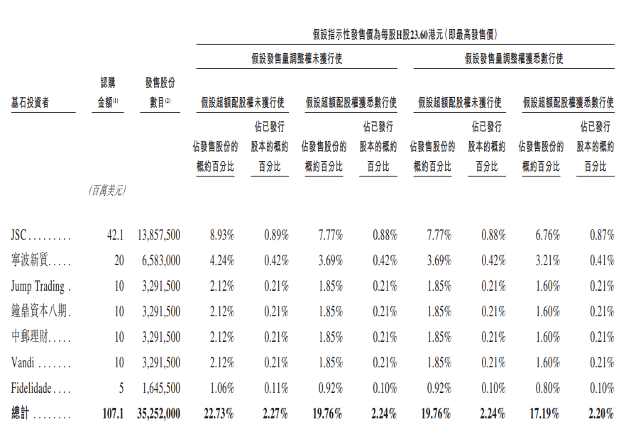 基石投资者包括:JSC、宁波新质、Jump Trading、钟鼎资本、中邮理财等。