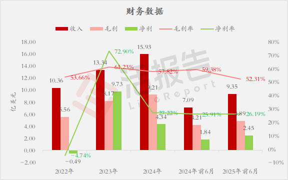 收入分别约为美元 10.36 亿、 13.34 亿、 15.93 亿、 7.09 亿、 9.35 亿, 2025 年前 6 月同比 +31.80%