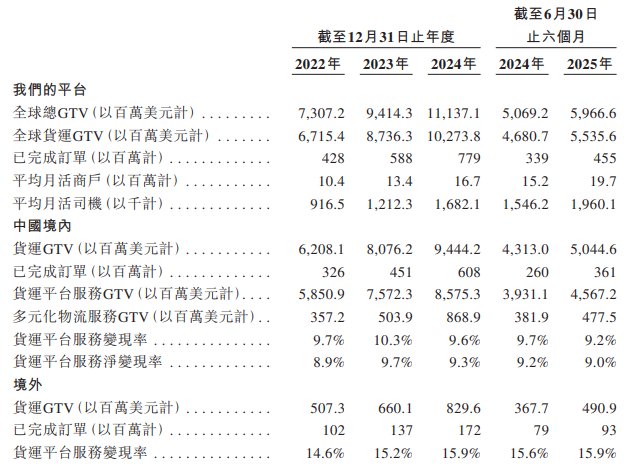2024 年,公司平台促成的已完成订单超过 779 百万笔,全球货运 GTV 10,273.8 百万美元,并有平均月活商户约 16.7 百万个,平均月活司机约 1.7 百万名。仅在 2025 年上半年,公司平台促成的已完成订单超过 455 百万笔,全球货运 GTV 5,535.6 百万美元,而我们有平均月活商户约 19.7 百万个,平均月活司机约 2.0 百万名。