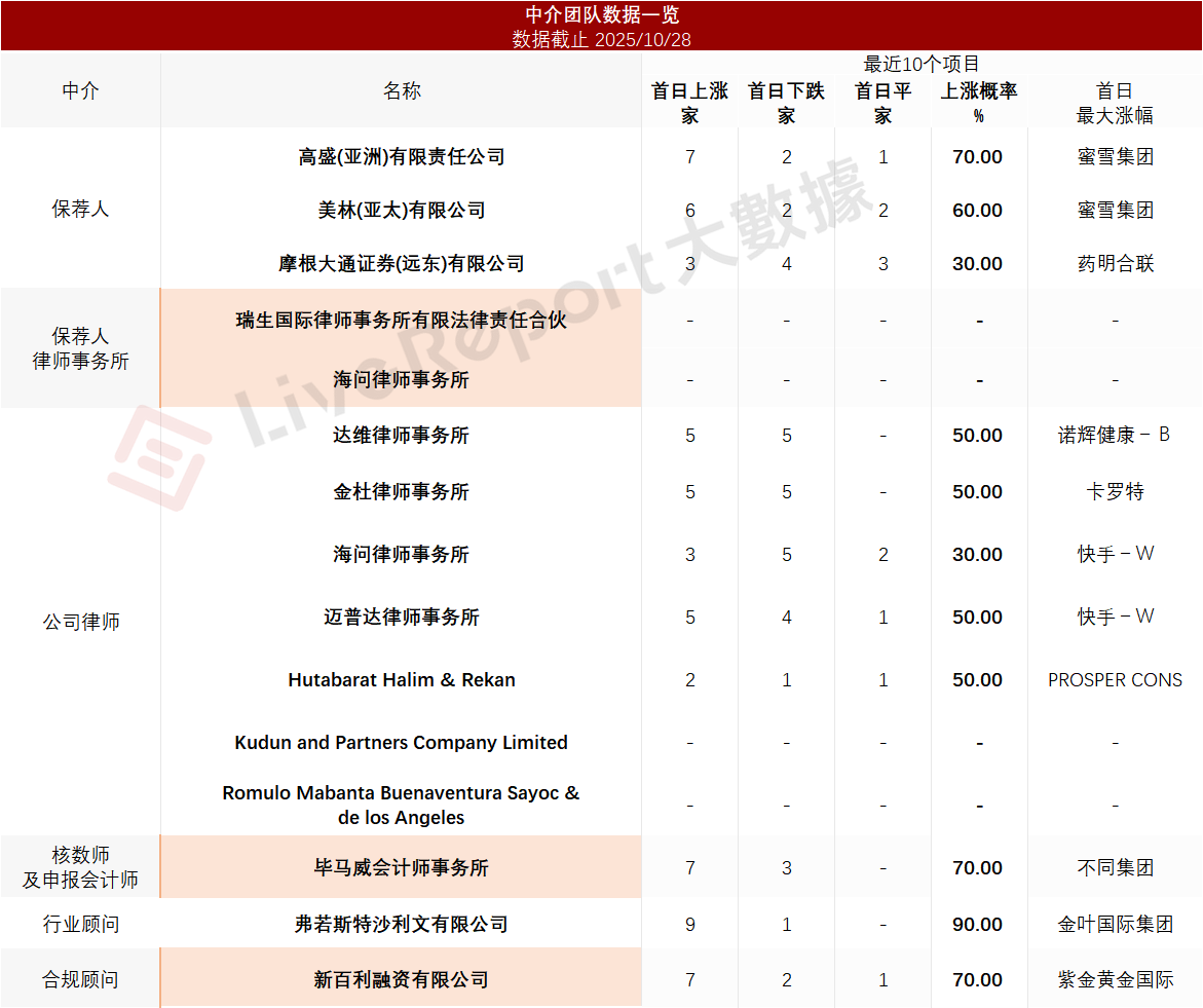 据LiveReport大数据统计,拉拉科技中介团队共计15家,其中保荐人3家,近10家保荐项目数据表现不足;公司律师共计7家,综合项目数据表现糟糕。整体而言中介团队历史数据表现不尽如人意。