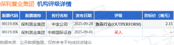 截至2025年10月30日收盘,保利置业集团(00119.HK)报收于1.85港元,下跌2.63%,成交量3379.5万股,成交额6335.53万港元。投行对该股的评级以跑赢行业(OUTPERFORM)为主,近90天内共有1家投行给出跑赢行业(OUTPERFORM)评级,近90天的目标均价为2.15港元。中金公司最新一份研报给予保利置业集团跑赢行业(OUTPERFORM)评级,目标价2.15港元。