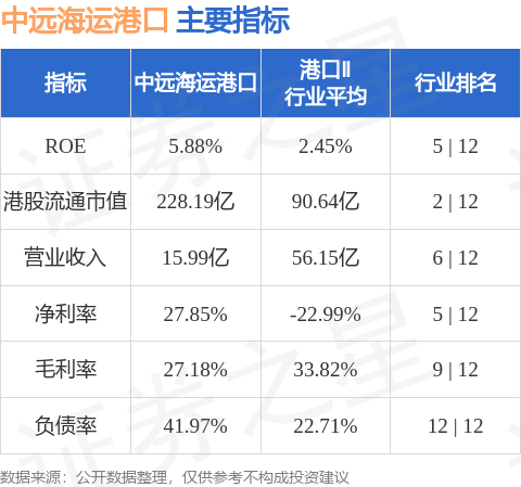 中远海运港口港股市值228.19亿港元,在港口Ⅱ行业中排名第2。主要指标见下表: