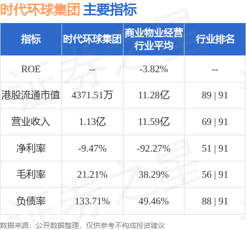 时代环球集团港股市值4371.51万港元,在商业物业经营行业中排名第89。主要指标见下表: