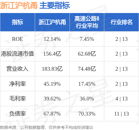 浙江沪杭甬港股市值156.4亿港元,在高速公路Ⅱ行业中排名第2。主要指标见下表: