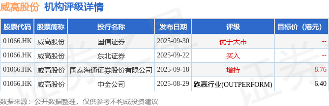 截至2025年10月30日收盘,威高股份(01066.HK)报收于5.36港元,下跌4.29%,成交量2130.23万股,成交额1.15亿港元。投行对该股的评级以跑赢行业(OUTPERFORM)为主,近90天内共有1家投行给出跑赢行业(OUTPERFORM)评级,近90天的目标均价为7.58港元。国信证券最新一份研报给予威高股份优于大市评级。