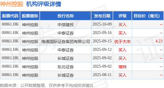 截至2025年10月30日收盘,神州控股(00861.HK)报收于3.09港元,上涨5.46%,成交量2010.62万股,成交额6226.82万港元。投行对该股的评级以买入为主,近90天内共有5家投行给出买入评级,近90天的目标均价为4.23港元。中信建投最新一份研报给予神州控股买入评级。