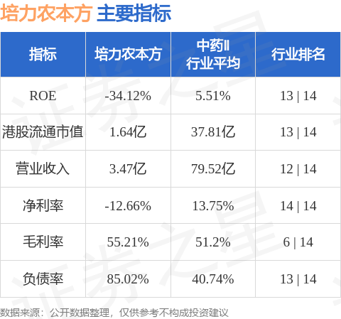 培力农本方港股市值1.64亿港元,在中药Ⅱ行业中排名第13。主要指标见下表: