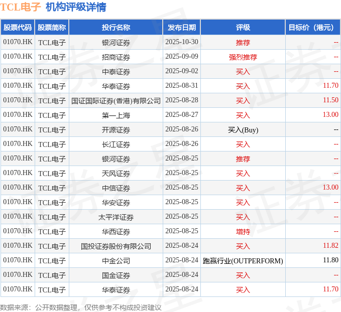 截至2025年10月30日收盘,TCL电子(01070.HK)报收于9.3港元,下跌2.31%,成交量817.0万股,成交额7637.81万港元。投行对该股的评级以买入为主,近90天内共有12家投行给出买入评级,近90天的目标均价为12.07港元。银河证券最新一份研报给予TCL电子推荐评级。