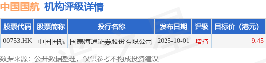 投行对该股的评级以增持为主,近90天内共有1家投行给出增持评级,近90天的目标均价为9.45港元。国泰海通证券股份有限公司最新一份研报给予中国国航增持评级,目标价9.45港元。