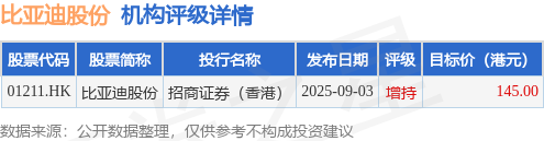 投行对该股的评级以增持为主,近90天内共有1家投行给出增持评级,近90天的目标均价为145港元。招商证券(香港)最新一份研报给予比亚迪股份增持评级,目标价145港元。