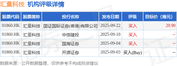 投行对该股的评级以买入为主,近90天内共有3家投行给出买入评级,近90天的目标均价为20.9港元。国证国际证券(香港)有限公司最新一份研报给予汇量科技买入评级,目标价20.9港元。