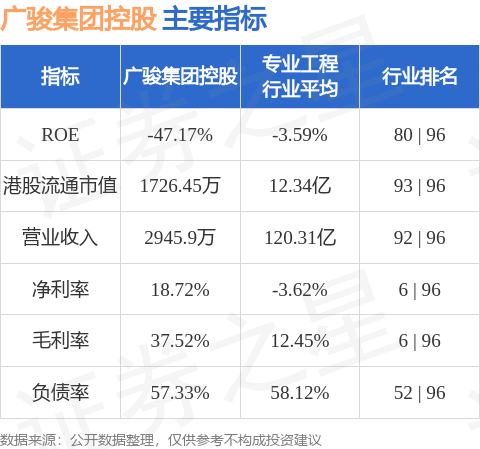 广骏集团控股港股市值1726.45万港元,在专业工程行业中排名第93。主要指标见下表: