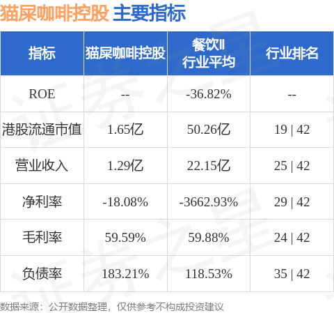 猫屎咖啡控股港股市值1.65亿港元,在餐饮Ⅱ行业中排名第19。主要指标见下表: