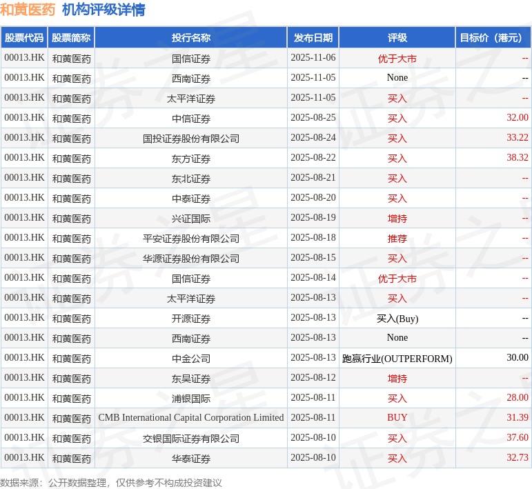 投行对该股的评级以买入为主,近90天内共有11家投行给出买入评级,近90天的目标均价为32.91港元。国信证券最新一份研报给予和黄医药优于大市评级。