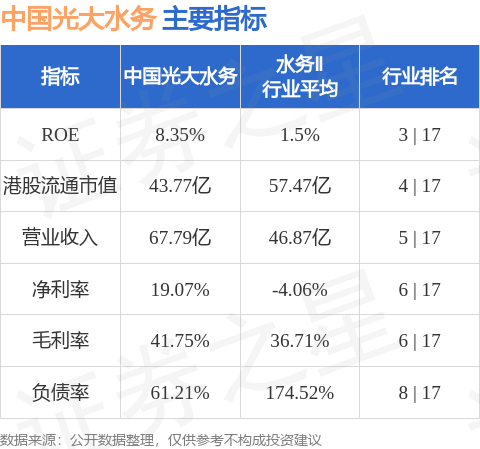 中国光大水务港股市值43.77亿港元,在水务Ⅱ行业中排名第4。主要指标见下表: