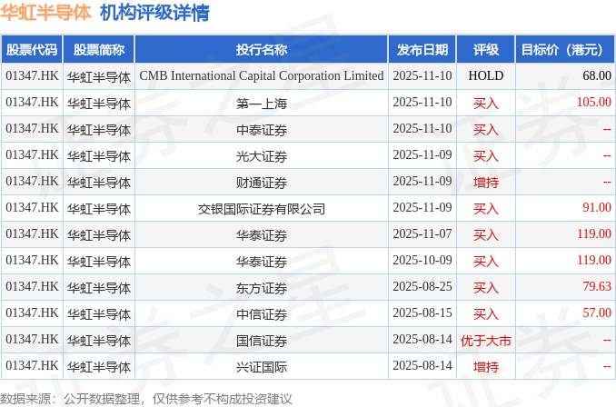 投行对该股的评级以买入为主,近90天内共有8家投行给出买入评级,近90天的目标均价为91.23港元。CMB International Capital Corporation Limited最新一份研报给予华虹半导体HOLD评级,目标价68港元。