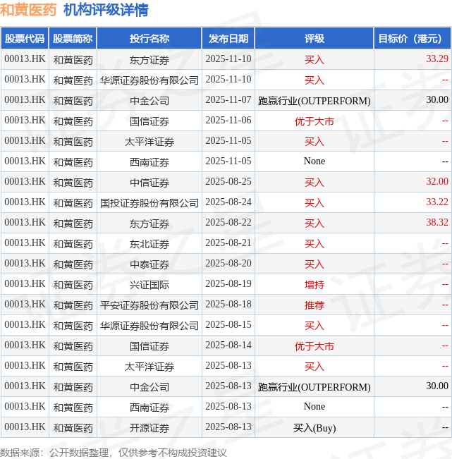 投行对该股的评级以买入为主,近90天内共有10家投行给出买入评级,近90天的目标均价为32.8港元。东方证券最新一份研报给予和黄医药买入评级,目标价33.29港元。