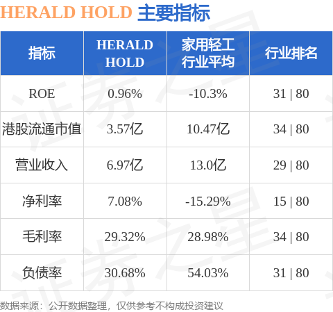 HERALD HOLD港股市值3.57亿港元,在家用轻工行业中排名第34。主要指标见下表: