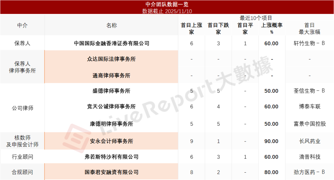 据LiveReport大数据统计,真实生物中介团队共计9家,其中保荐人1家,近10家保荐项目数据表现一般;公司律师共计3家,综合项目数据表现较差。整体而言中介团队历史数据表现不足。