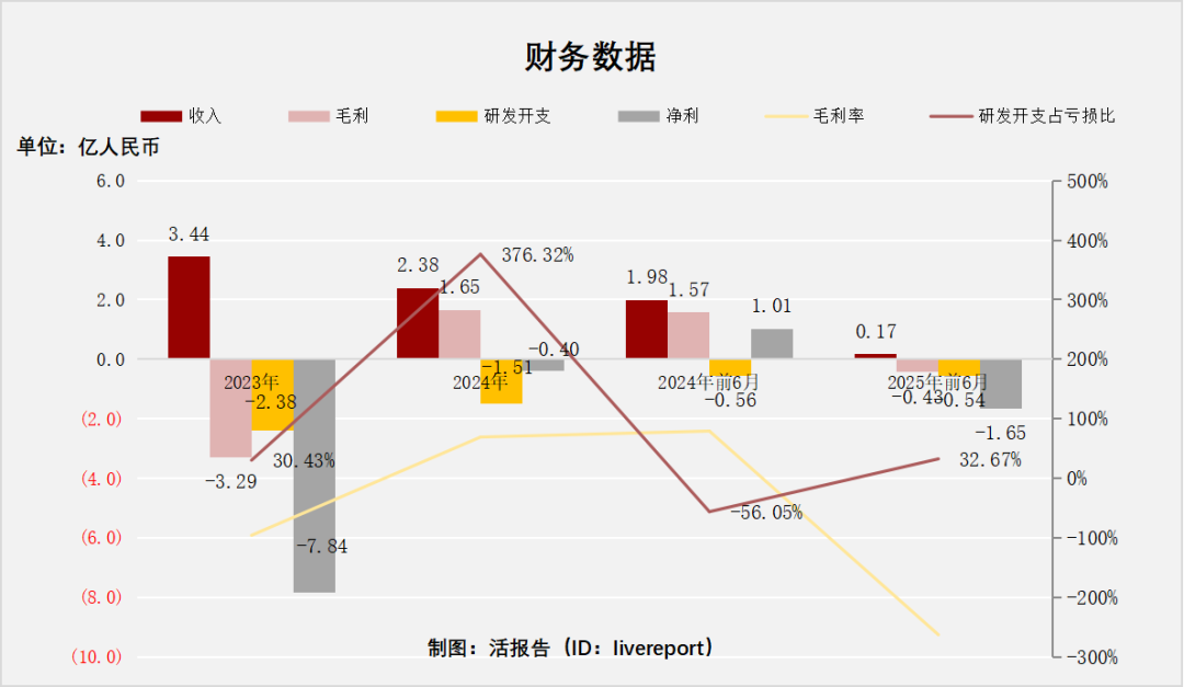 毛利分别约为人民币-3.29亿元、1.65亿元、1.57亿元及-0.43亿元,2024年同比增长率为-150.05%,2025年前6月同比增长率为-127.63%;