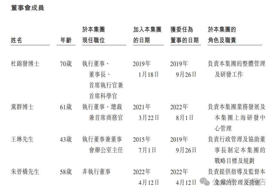 行董事。杜锦发博士为董事长、执行董事、首席执行官兼首席科学官,主要负责集团的整体管理及研发工作。
