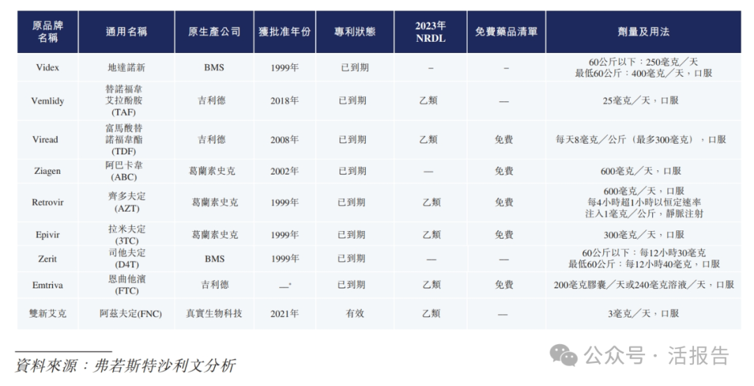 根据弗若斯特沙利文(Frost & Sullivan)的报告,中国市场上的大部分HIV药物为单剂抗逆转录病毒药物,而不是在发达市场更容易获得的含有多种ART制剂的复合药物。由于作为一种NRTI(一类被广泛用作一线cART方案中骨干药物的抗逆转录病毒药物),阿兹夫定可能会与不同机制的药物联合作用以形成各种cART方案,故不同类别的单剂抗逆转录病毒药物(例如NNRTI或INSTI)不被认为是阿兹夫定的替代品或竞争产品。下表载列截至最后实际可行日期阿兹夫定及其他在中国上市并可能与阿兹夫定竞争或联合使用的用于治疗HIV感染的NRTI药物概要: