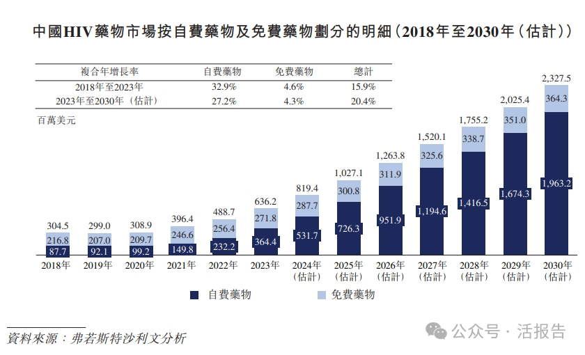 中国HIV药物市场由2018年的304.5百万美元增长至2023年的636.2百万美元,复合年增长率为15.9%。预计2030年将达到2,327.5百万美元,2023年至2030年的复合年增长率为20.4%,远高于同期全球HIV药物市场的估计复合年增长率。根据弗若斯特沙利文的资料,该增长反映出诊断及治疗的增加,以及预期将有更多的创新HIV药物纳入NRDL,从而将有更大的患者群体接受创新HIV药物。与世卫组织的推荐类似,中国疾病预防控制中心于2024年发布的HIV诊疗指南亦将核苷类药物列为所有HIV一线抗逆转录病毒治疗方案的骨干药物,表明其于HIV治疗方面的重要意义及于市场规模方面的增长潜力。