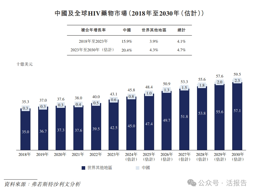 根据弗若斯特沙利文(Frost & Sullivan)的报告,全球HIV药物市场由2018年的353亿美元增长至2023年的431亿美元,复合年增长率为4.1%。估计2030年将达到595亿美元,2023年至2030年的复合年增长率为4.7%。创新疗法预期将持续推动发达及新兴市场的增长。特别是,核苷类药物作为世卫组织推荐用于HIV感染患者所有一线抗逆转录病毒治疗的骨干药物,在HIV药物市场中占据重要地位,并具有巨大的增长潜力。
