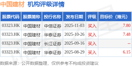 截至2025年11月11日收盘,中国建材(03323.HK)报收于5.53港元,上涨0.55%,成交量1092.96万股,成交额6037.42万港元。投行对该股的评级以买入为主,近90天内共有4家投行给出买入评级,近90天的目标均价为7.14港元。中信证券最新一份研报给予中国建材买入评级,目标价7.8港元。