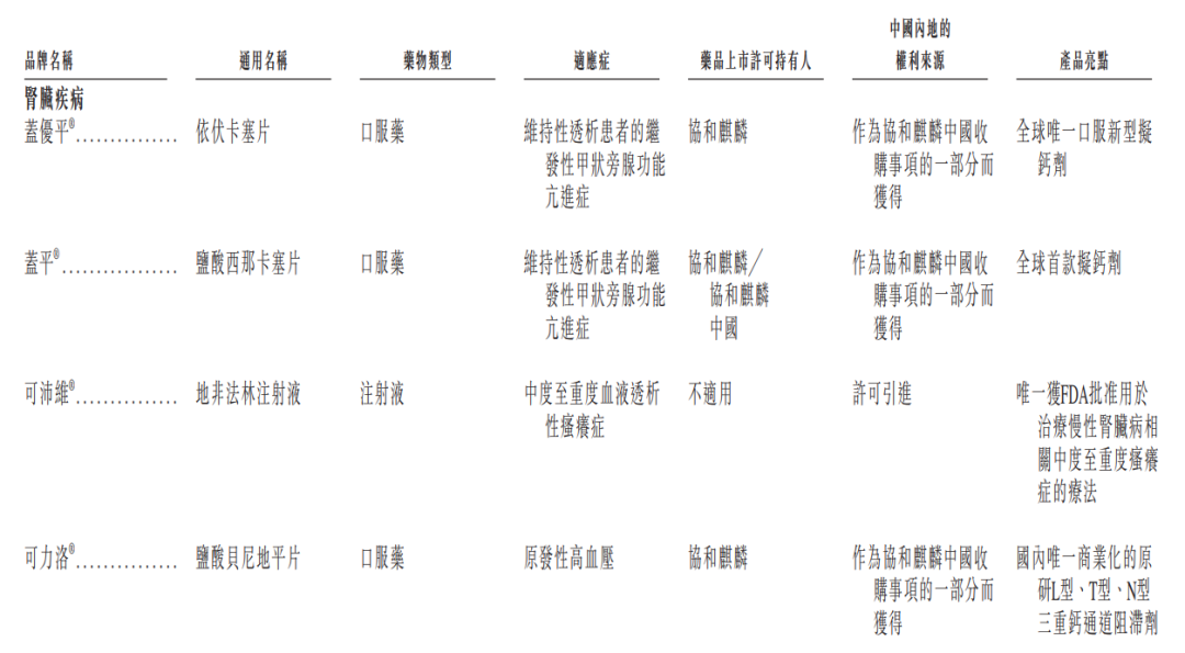 公司已打造多元且差异化的产品组合,广泛覆盖肾脏与血液疾病领域,并延伸至呼吸系统及皮肤疾病等其他重大疾病领域。根据灼识咨询的资料,截至最后实际可行日期,公司的产品组合涵盖六种肾脏药物,是中国制药企业中治疗肾脏疾病商业化原研药数量最多的企业。