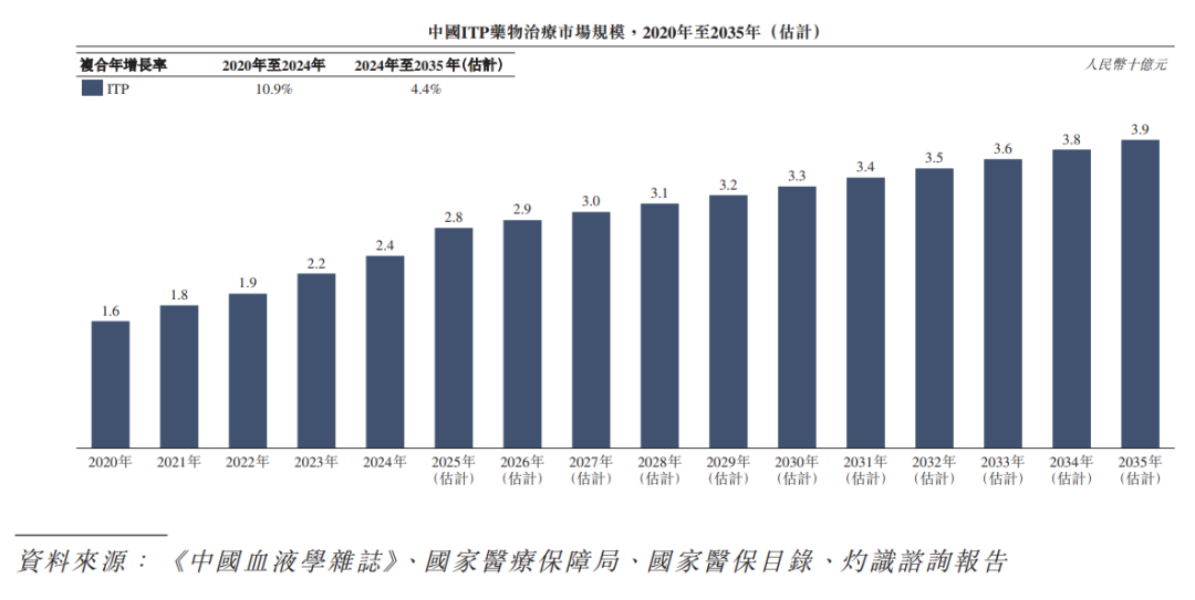 中国ITP药物治疗市场规模有所增长,从2020年的人民币16亿元增至2024年的人民币24亿元,预计2035年将达到人民币39亿元。