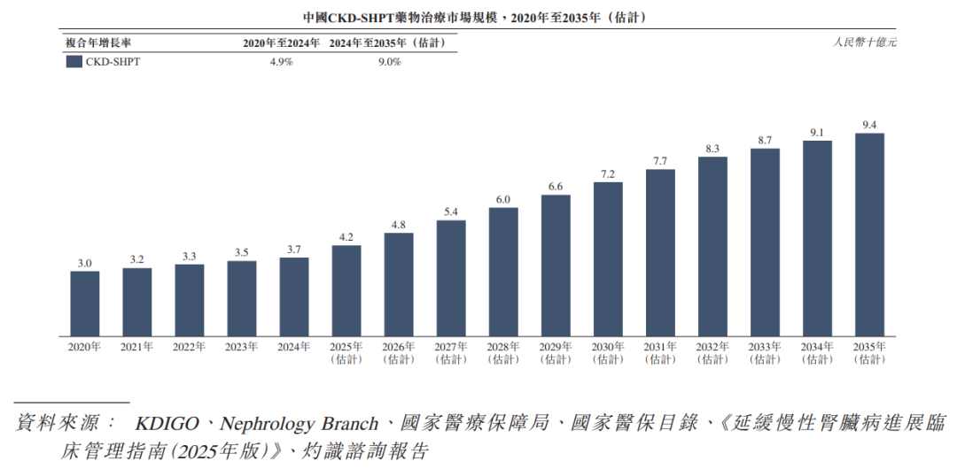 根据弗若斯特沙利文(Frost & Sullivan)的报告,中国CKD患者SHPT的药物治疗市场已从2020年的人民币30亿元增长至2024年的人民币37亿元,复合年增长率为4.9%,预计2024年至2035年将以9.0%的复合年增长率进一步增长,于2035年达到人民币94亿元。