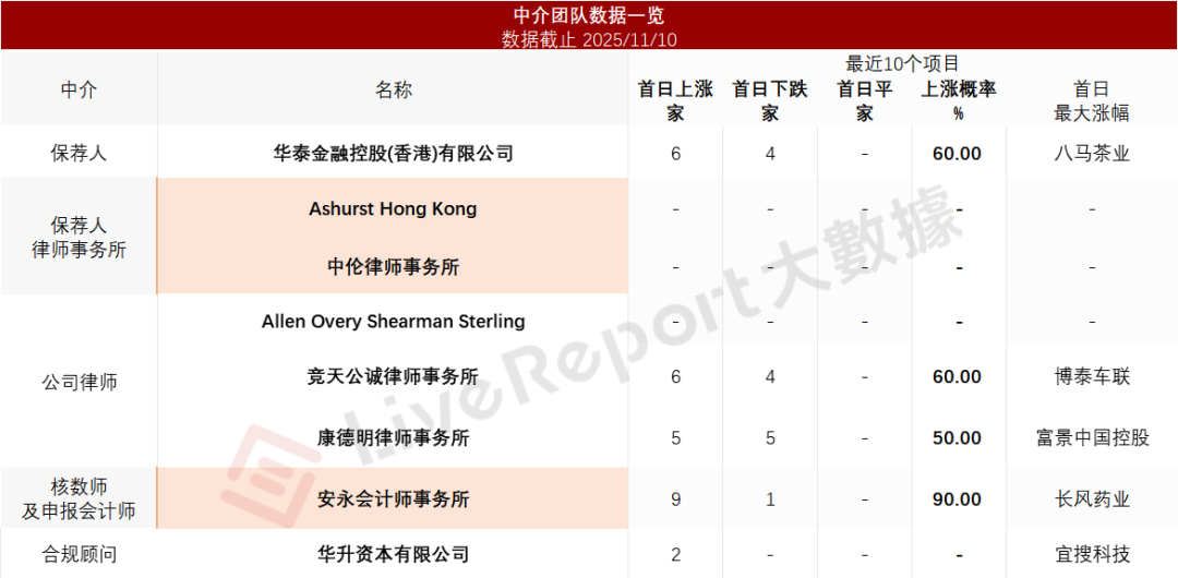 据LiveReport大数据统计,维健医药中介团队共计8家,其中保荐人1家,近10家保荐项目数据表现一般;公司律师共计3家,综合项目数据表现较差。整体而言中介团队历史数据表现不足。
