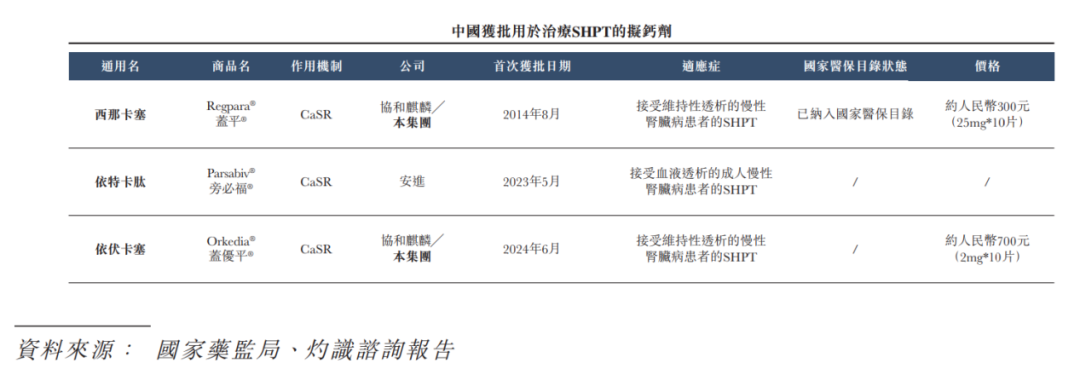 公司的拟钙剂(尤其是新一代拟钙剂,如依伏卡塞)展现出显着优势。其可同步降低血钙与血磷水平,相较于早期治疗方案可进一步降低胃肠道副作用与低钙血症发生率。以盖优平®(依伏卡塞)为代表的新一代拟钙剂正逐步成为具有发展潜力的替代选择。