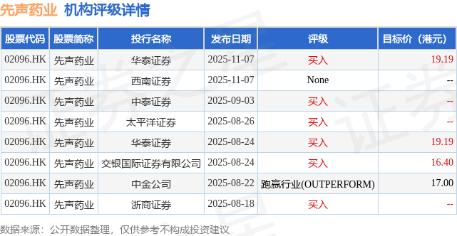 投行对该股的评级以买入为主,近90天内共有6家投行给出买入评级,近90天的目标均价为17.94港元。华泰证券最新一份研报给予先声药业买入评级,目标价19.19港元。