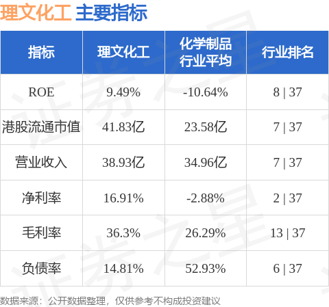 理文化工港股市值41.83亿港元,在化学制品行业中排名第7。主要指标见下表: