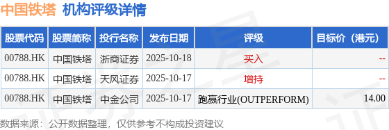 投行对该股的评级以跑赢行业(OUTPERFORM)为主,近90天内共有1家投行给出跑赢行业(OUTPERFORM)评级,近90天的目标均价为14港元。浙商证券最新一份研报给予中国铁塔买入评级。