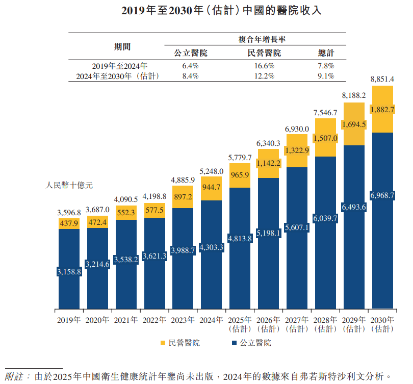 )的数据,民营医院的收入由2019年的人民币4,379亿元增至2024年的人民币9,447亿元,2019年至2024年的复合年增长率为16.6%,预计2030年达到人民币18,827亿元,2024年至2030年的复合年增长率为12.2%。