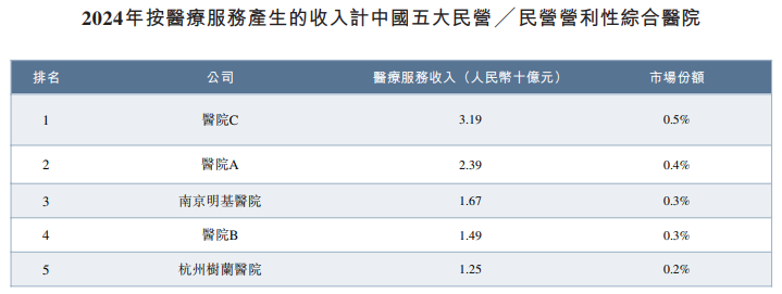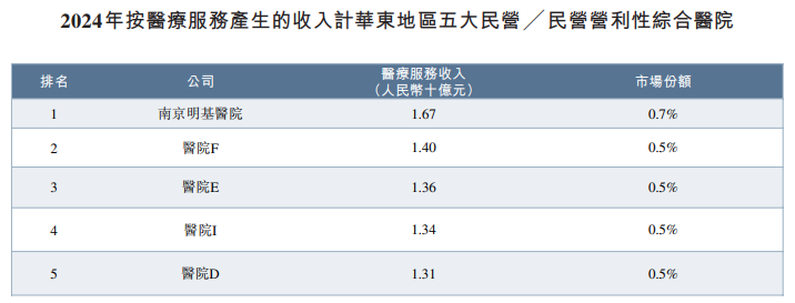 根据弗若斯特沙利文的数据,以2024年总收入计,公司是华东地区最大的民营营利性综合医院集团,于华东地区的市场份额为1.0%;以相同口径计,公司在全国民营营利性综合医院集团中排名第七,于中国的市场份额为0.4%;以2024年的床均收入计,公司在中国内地所有民营营利性综合医院集团中排名第一。